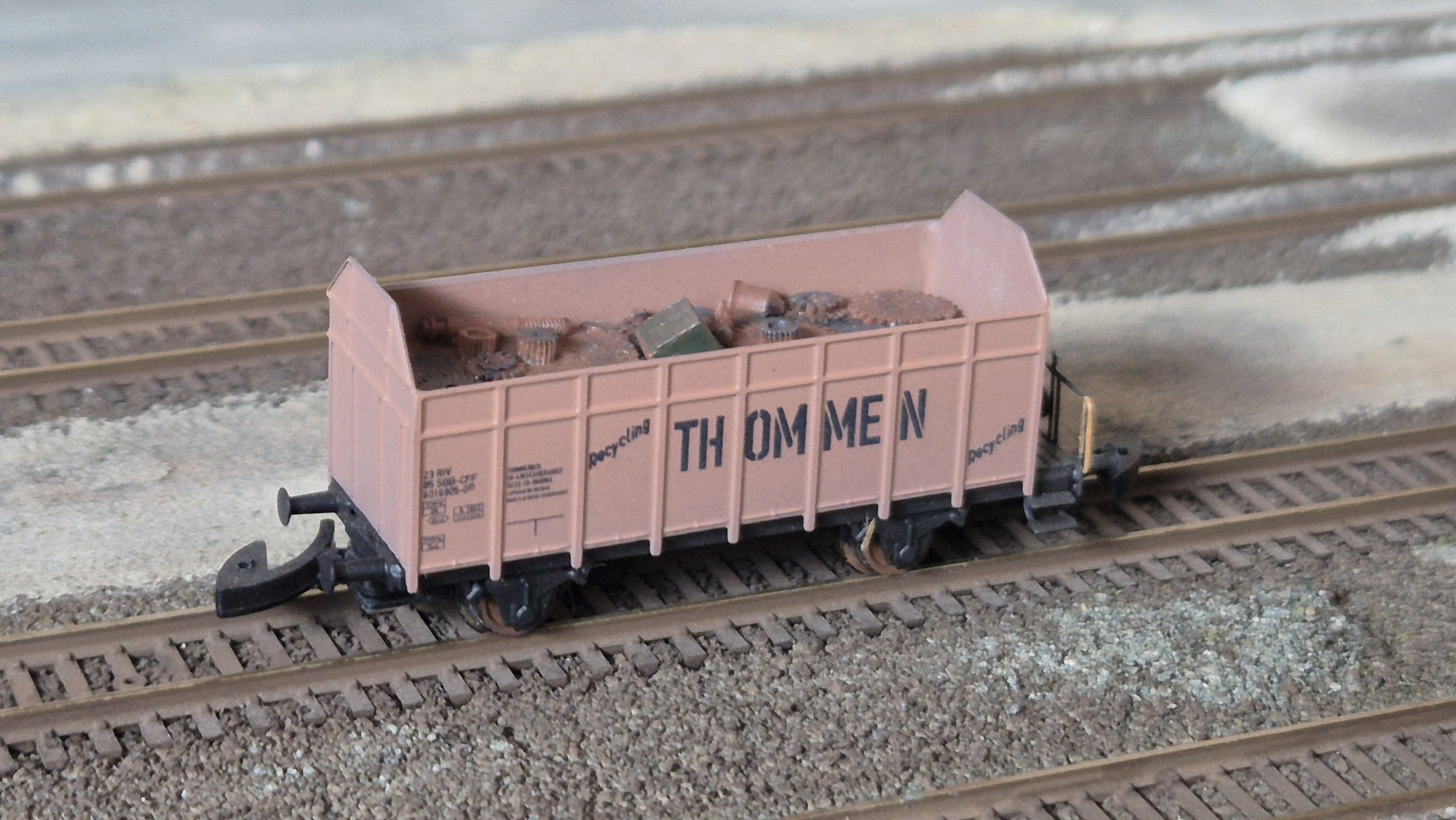 Vorbild: Für den Transport von ölhaltigem Schrott und Metallspänen beschaffte die Firma Thommen in Kaiseraugst zwei offene Güterwagen mit völlig geschweisstem Laderaum ohne Türen, die eine Kontaminierung der Umwelt beim Transport verhinderten. Die Wagen sind bei den SBB immatrikuliert. Beide Wagen sind mit dem Firmenlogo versehen und tragen das gerahmte P für Privatwagen.